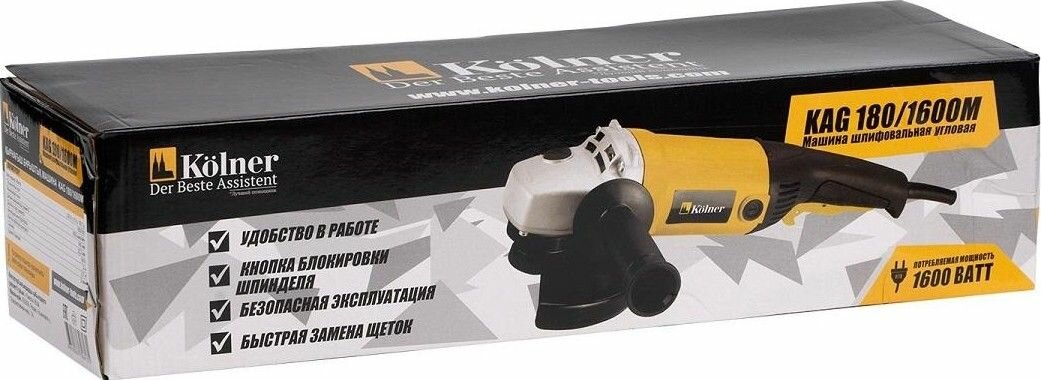 KOLNER KAG 180/1600М Машина шлифовальная угловая 1600 Вт, 8500об/мин, диаметр диска 180 мм, посадочный диаметр диска 22,2мм, диаметр резьбы диска М14