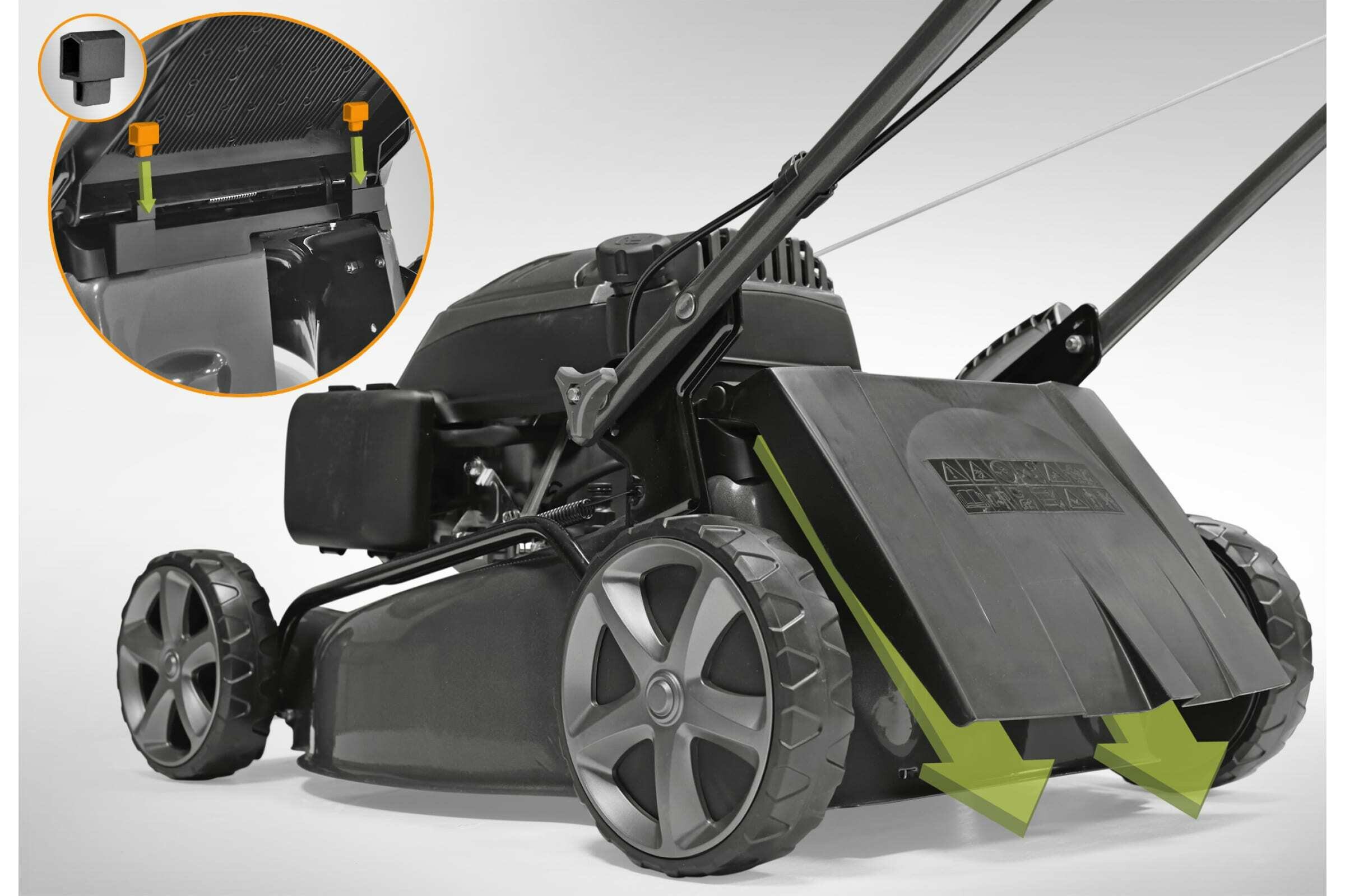 | Дополнительные функции | возможность установки мульчирующей насадки / регулировка высоты скашивания / тормоз двигателя |