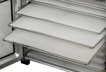 | Плюсы: | Очень хорошее качество и вместимость сушилки. Быстро засушивает фрукты и овощи (и не только). Идеально подходит для сушки пастилы и мяса. Имеется 30 поддонов, трёх разных видов. Сушит эффективно, проверяли на персиках , они сложны для сушки из-за наличия большого количества влаги. Так же пробовали сушить мясо, потратили 7 часов и довольны результатом. Очень приятно, что имеется наличие стекла в дверце, благодаря ей, хорошо видно состояние продукта. Подойдет для кухни, если есть место, прибор достаточно габаритен. Но габариты соответствуют вместимости сушилки. Имеется очень удобная сенсорная панель управления, с таймером до 24 часов и регулировкой температуры от 35 до 75 градусов. |