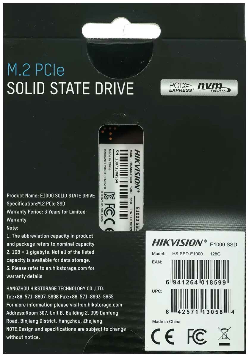 SSD M.2 2280 NVMe Gen3x4 HIKVision E1000, 128Gb, Hs-ssd-e1000/128g, R990Mb/s, W650Mb/s, 80TBW