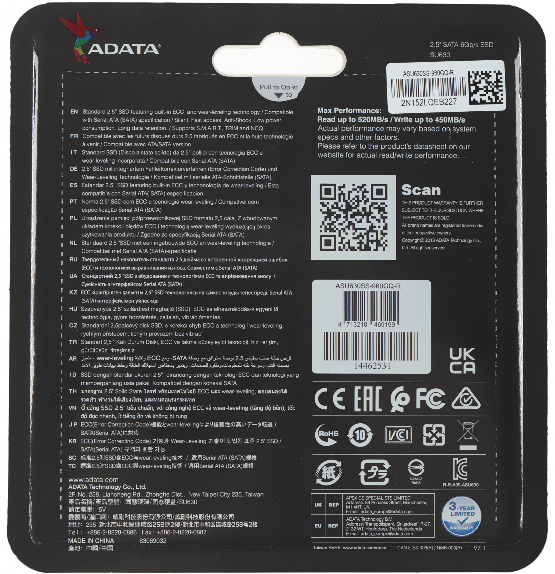 Твердотельный накопитель ADATA SSD Ultimate SU630, 960GB, 2.5" 7mm, SATA3