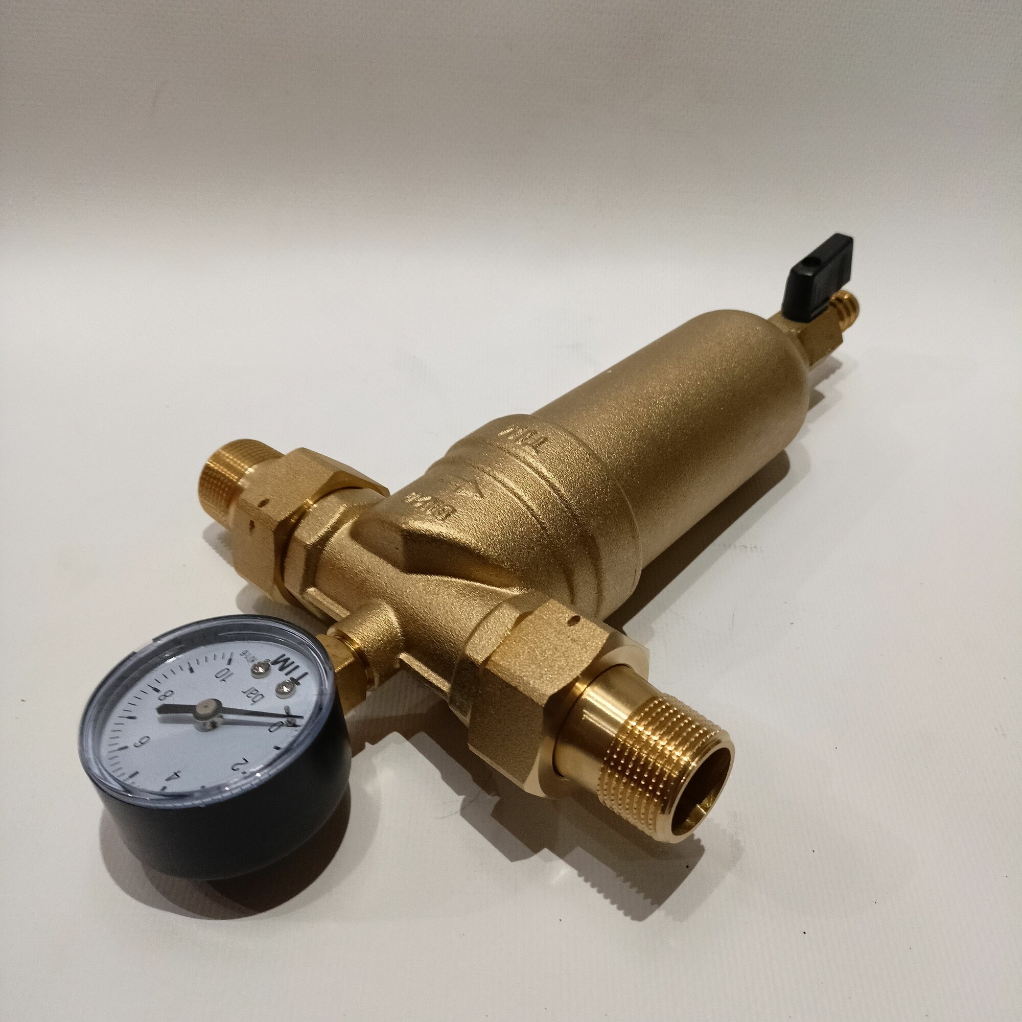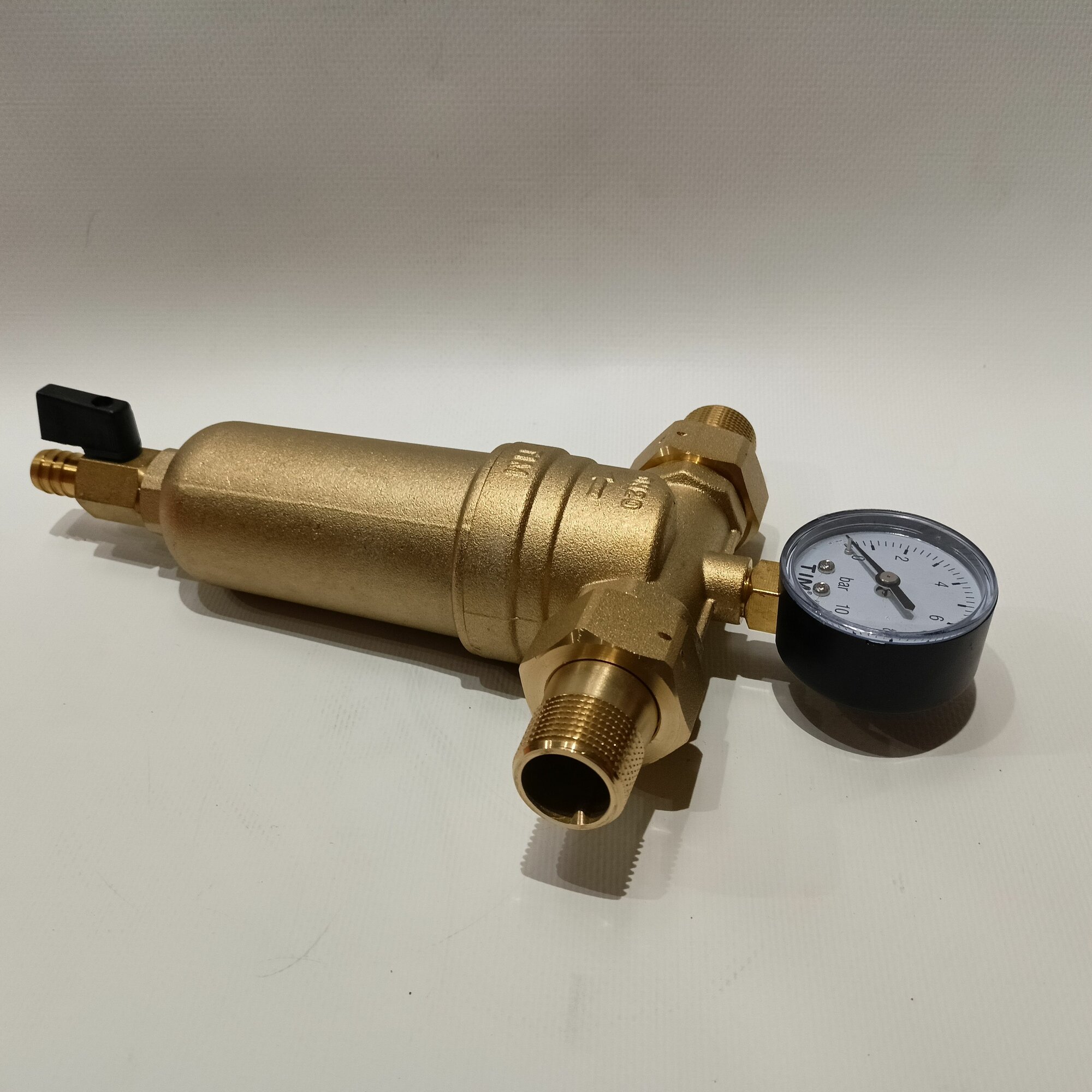Фильтр самопромывной с американками резьба наружная 1/2" с манометром и сливным краном, прозрачный корпус для холодной воды TIM артикул JH-1002