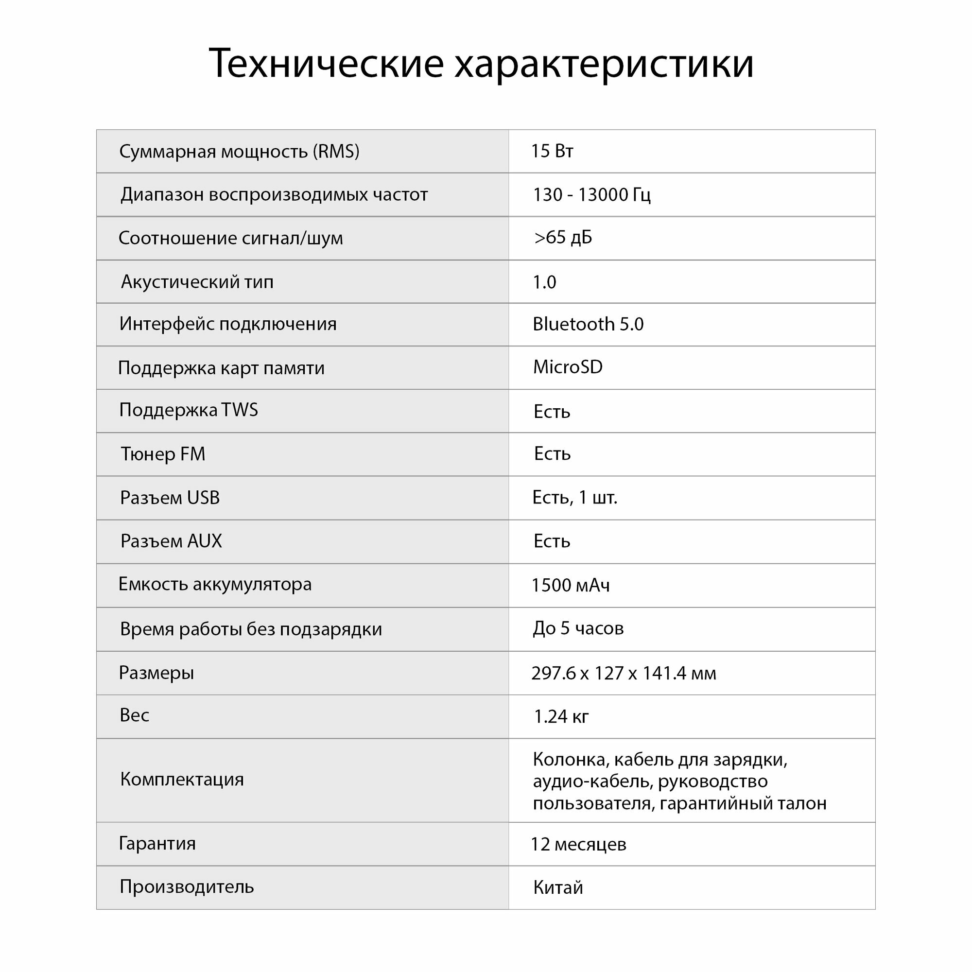 | Плюсы: | Сделана аккуратно, с виду крепкая, выглядит стильно. Есть радио. Быстро подключается через bluetooth. Покупал, чтобы брать с собой на природу. Валит громко, звук качественный, без хрипов. Хватает заряда на часов 5-6, заряжается около двух часов. |
