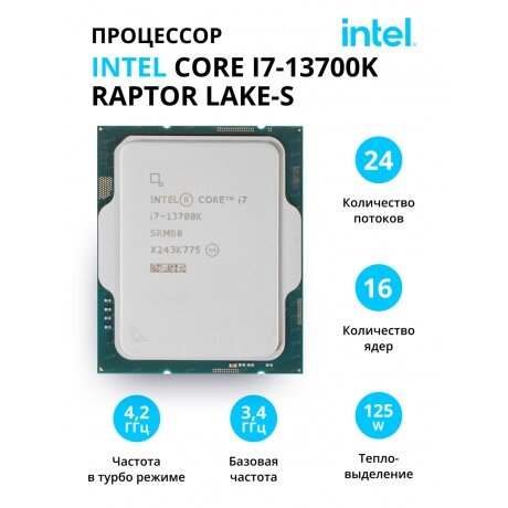 Процессор Intel Core i7-13700K BOX (Raptor Lake, Intel 7, C16(8EC/8PC)/T24, Efficient-core Base 2.50GHz(EC), Performance Base 3,40GHz(PC), Turbo 5,40GHz, Max Turbo 5,40GHz, UHD 770, L2 24Mb, Cache 30Mb, Base TDP 125W, Turbo TDP 253W, w/o cooler, S1700)