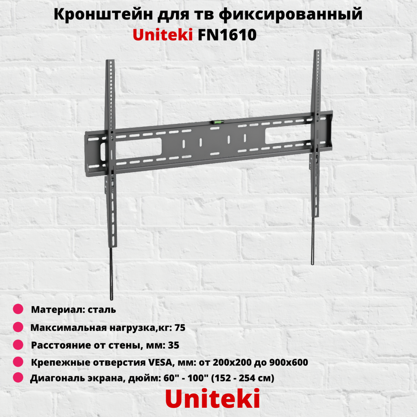 СохранитьКронштейн UniTeki FN1610 для телевизора (монитора) на стену фиксированный для диагонали от 60 до 100 дюймов, макс. нагрузка до 75 кг интересное: