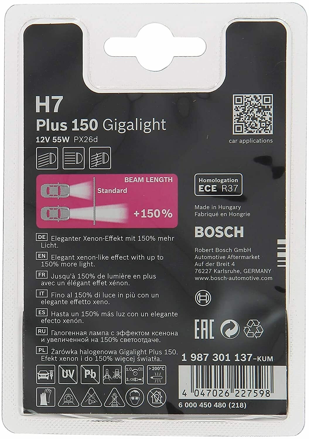 Лампа 12V 55W H7 Gigalight Plus 150 (Блистер 1 Шт) Bosch арт. 1 987 301 137