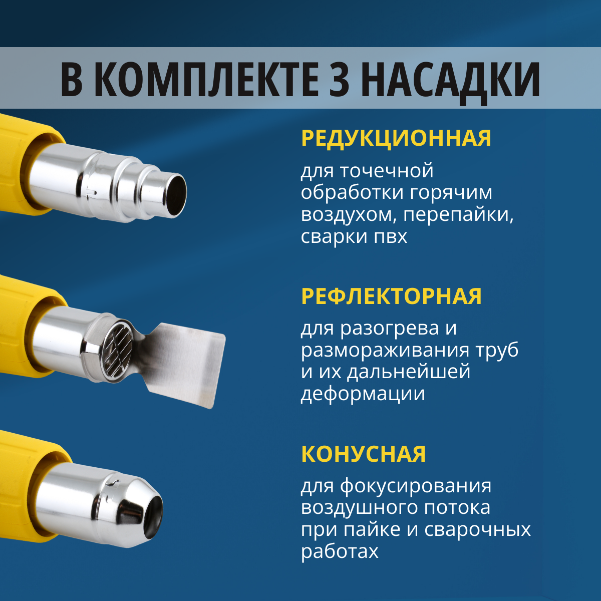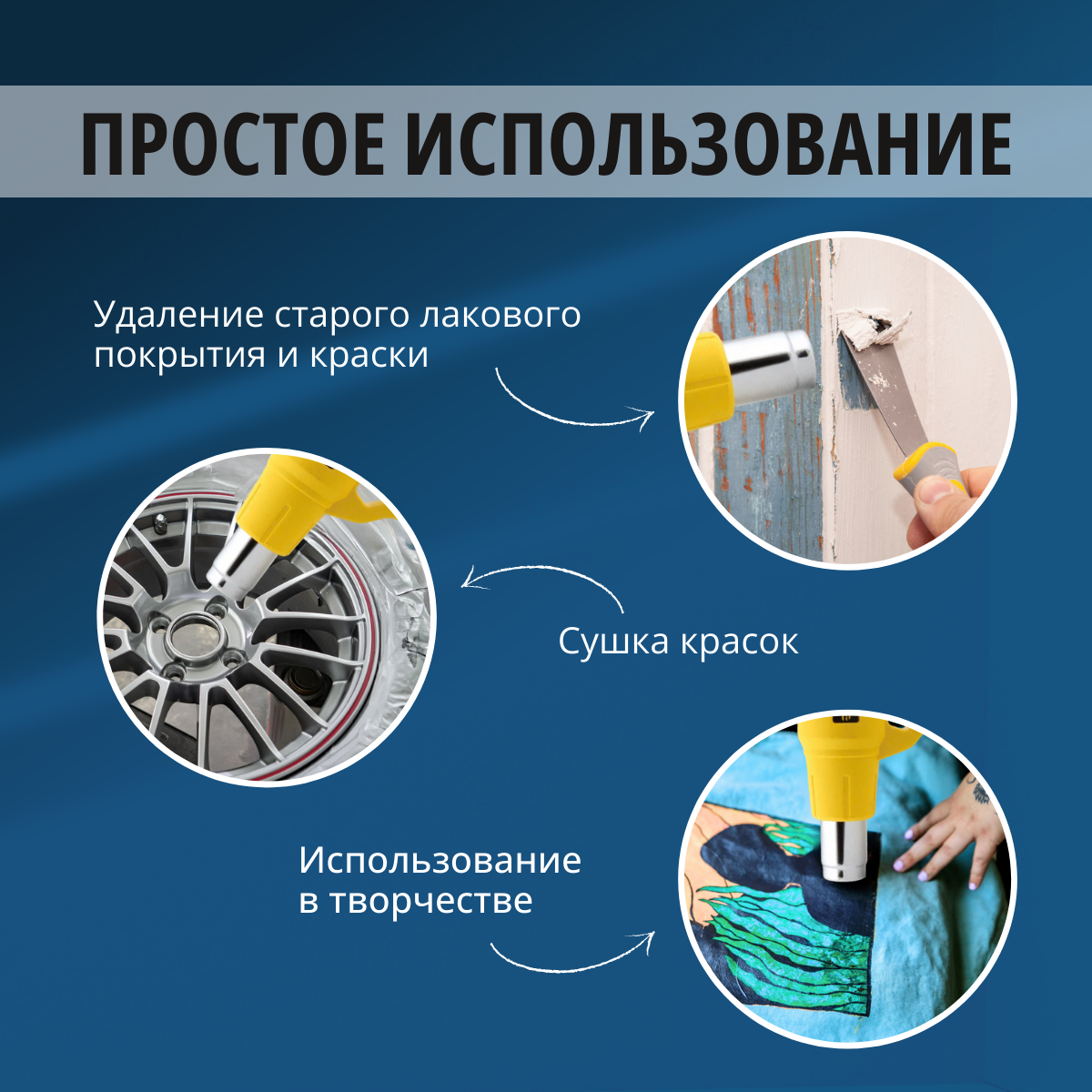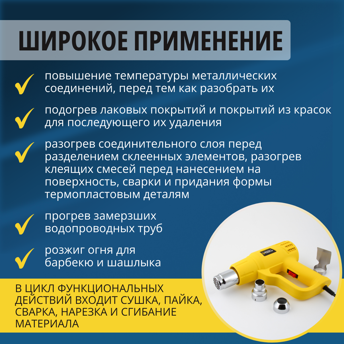 | Назначение | удаление краски / разморозка труб / размягчение покрытий / сварка пластика / изоляция проводов / подсушивание краски |