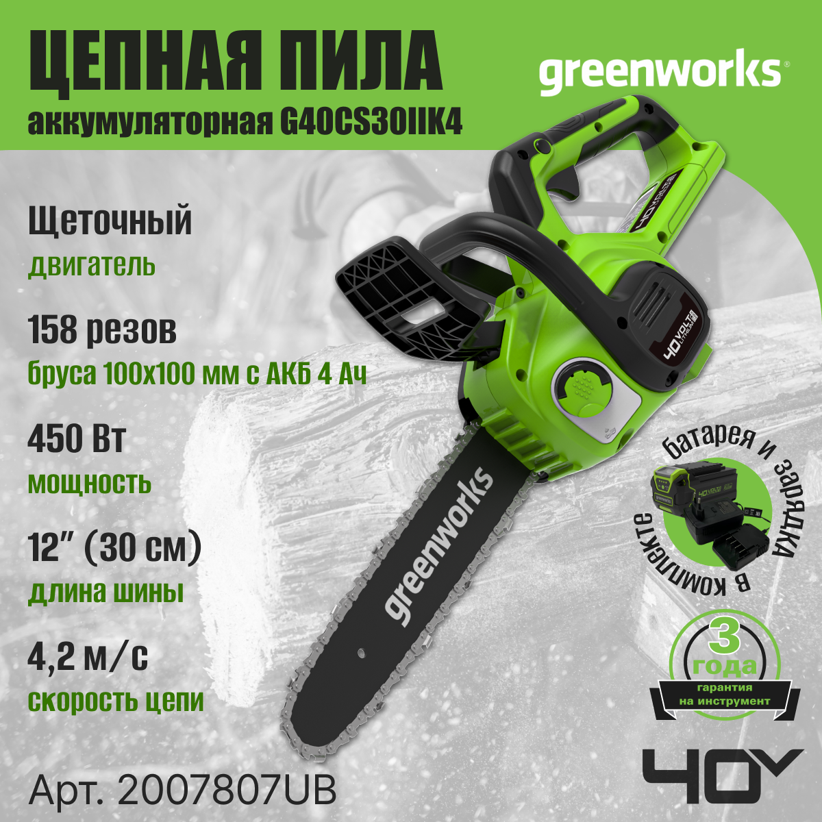 Аккумуляторная пила Greenworks G40CS30IIK4 c АКБ 4 Ач и ЗУ