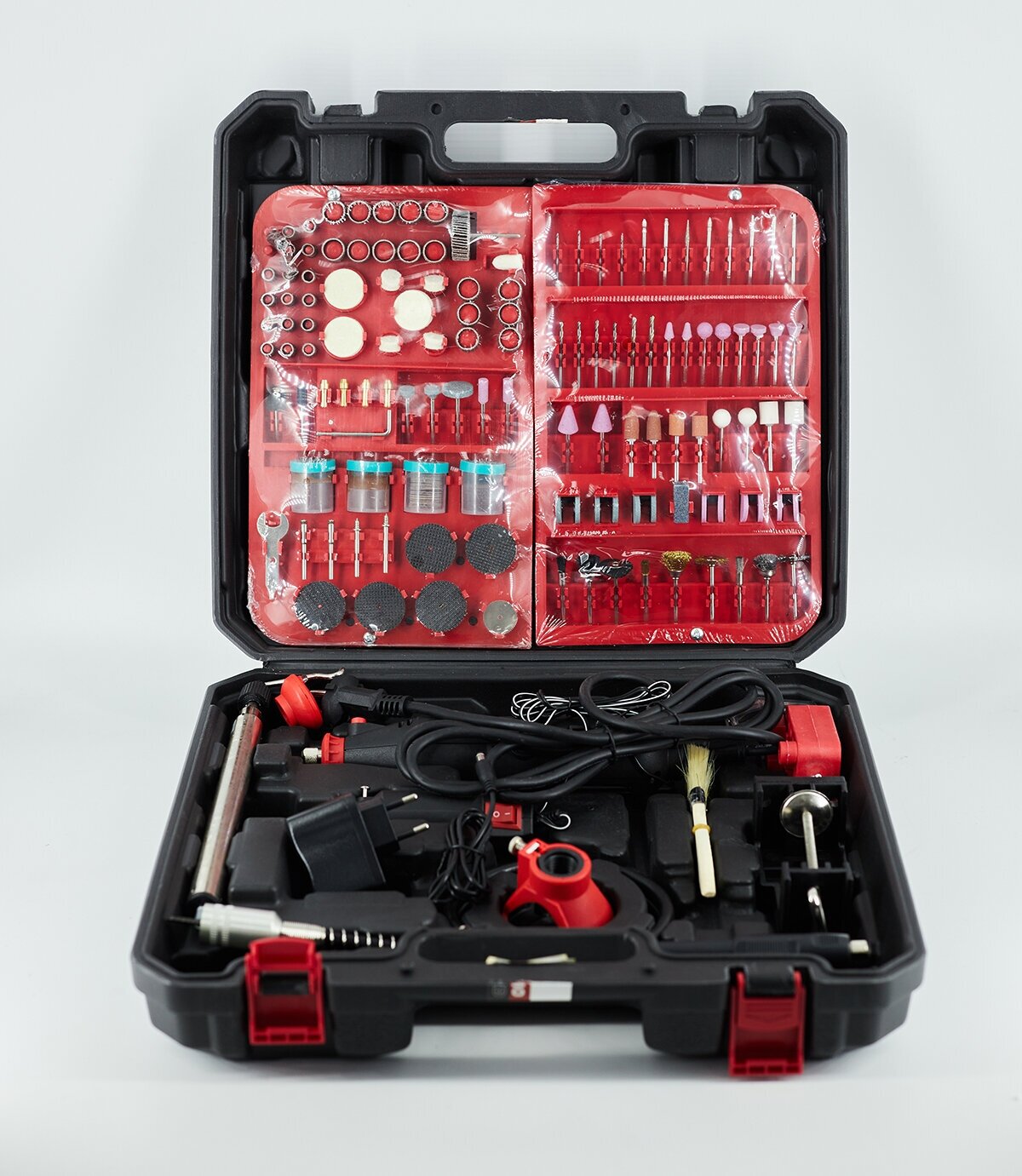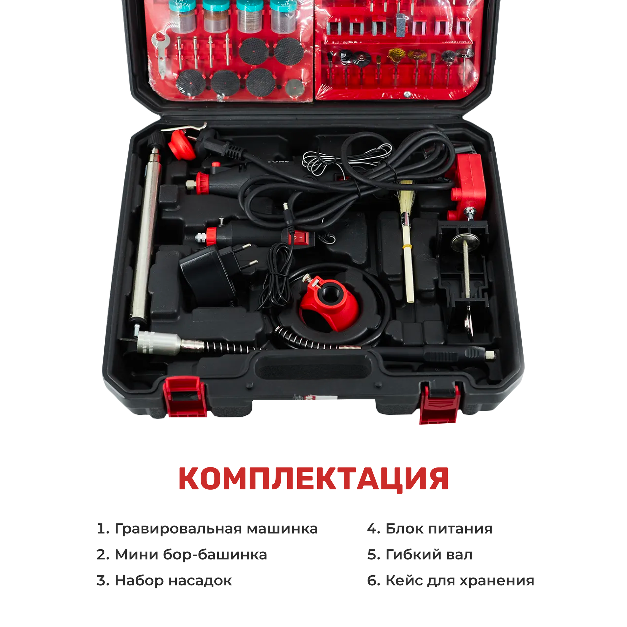| Комплектация | мини-бормашина 12В, блок питания (адаптер) 12В; Электрическая гравировальная машина 170Вт, 220В, 50Гц; набор насадок 236 шт, инструкция, пластиковый чемодан |