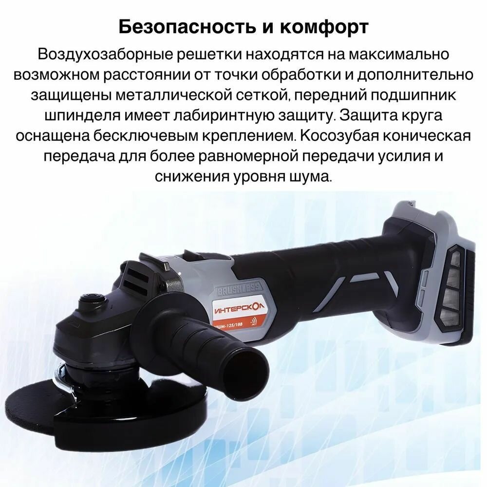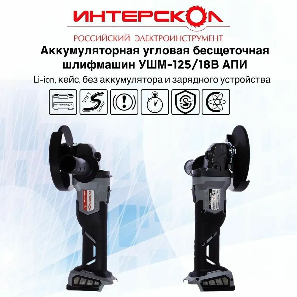 Бесщеточная аккумуляторная угловая шлифмашина ИНТЕРСКОЛ УШМ-125/18В 578.0.0.70, кейс, АПИ, без АКБ и ЗУ