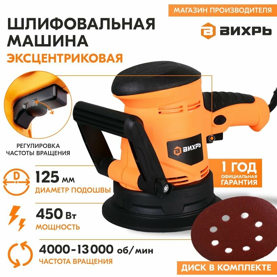Эксцентриковая шлифовальная машина Вихрь ЭШМ-125Э, 450 Вт, 4 000 - 13 000 об//мин