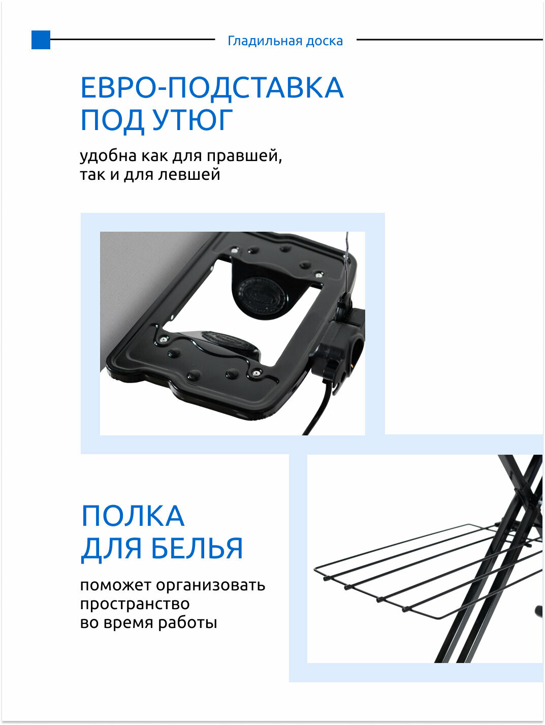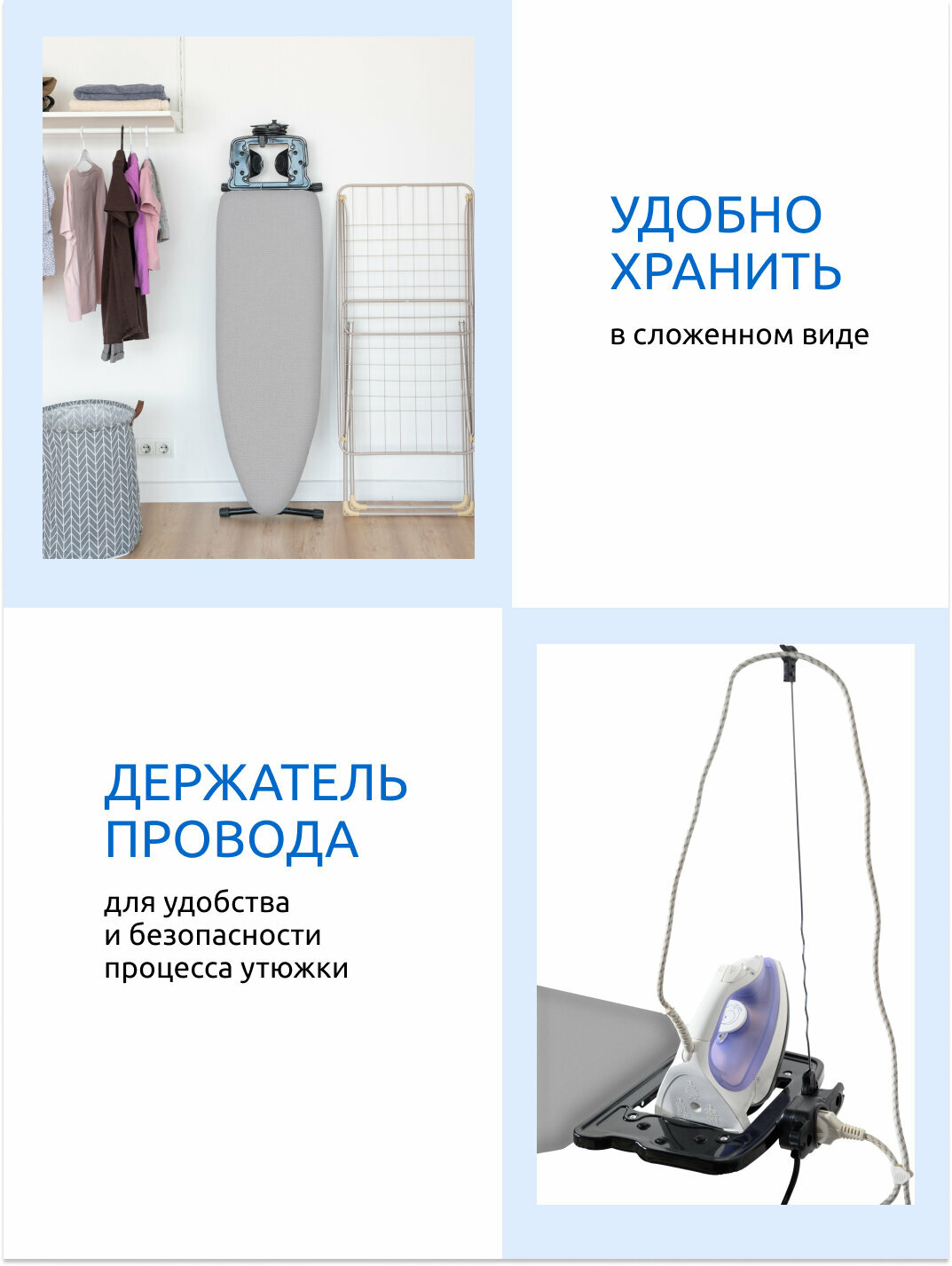 | Плюсы: | Регулируется высота, широкая и длинная, удобная подставка для утюга и держатель для шнура, наличие розетки и нарукавника, сменный чехол |