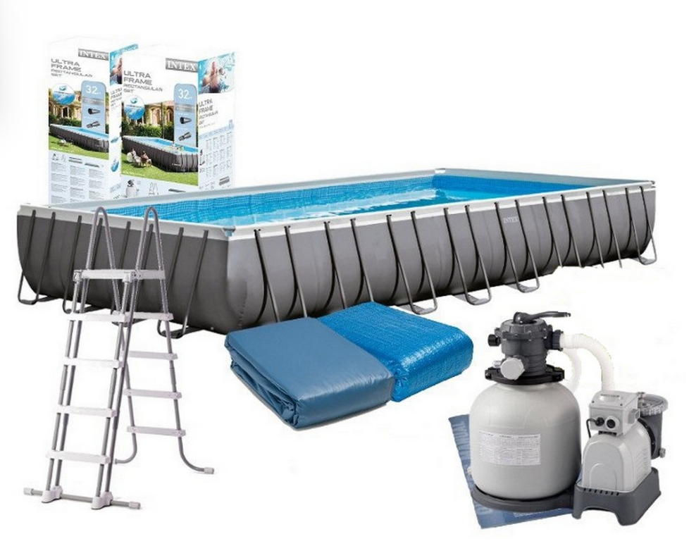 INTEX 26378 Бассейн каркасный прямоугольный Intex Ultra XTR Rectangular Frame Pools 975х488х132 см (песчаный фильтр-насос 8 куб/ч + хлорогенератор, лестница, тент, настил, набор для чистки, волейбольная сетка)