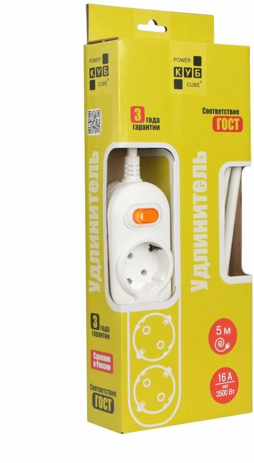 Удлинитель Power Cube PC-1-5М, 3 розетки, 16А / 3500 Вт белый 5 м
