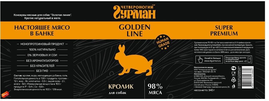 Корм консервированный для собак Четвероногий Гурман "Golden line Кролик", 340 г х 6 шт.