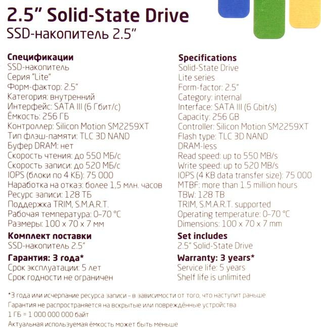 Cbr накопитель SSD-256GB-2.5-LT22, Внутренний SSD-накопитель, серия "Lite", 256 GB, 2.5", SATA III 6 Gbit s, SM2259XT, 3D TLC NAND, R W speed up to 550 520 MB s, TBW TB 128