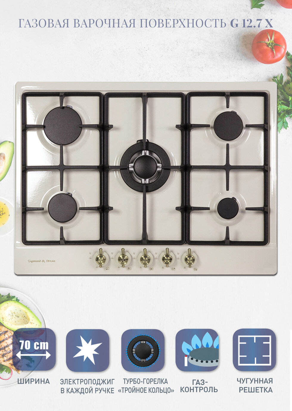 Варочная панель газ. Zigmund&Shtain G 12.7 X/беж 5 конф решётка чугун Китай