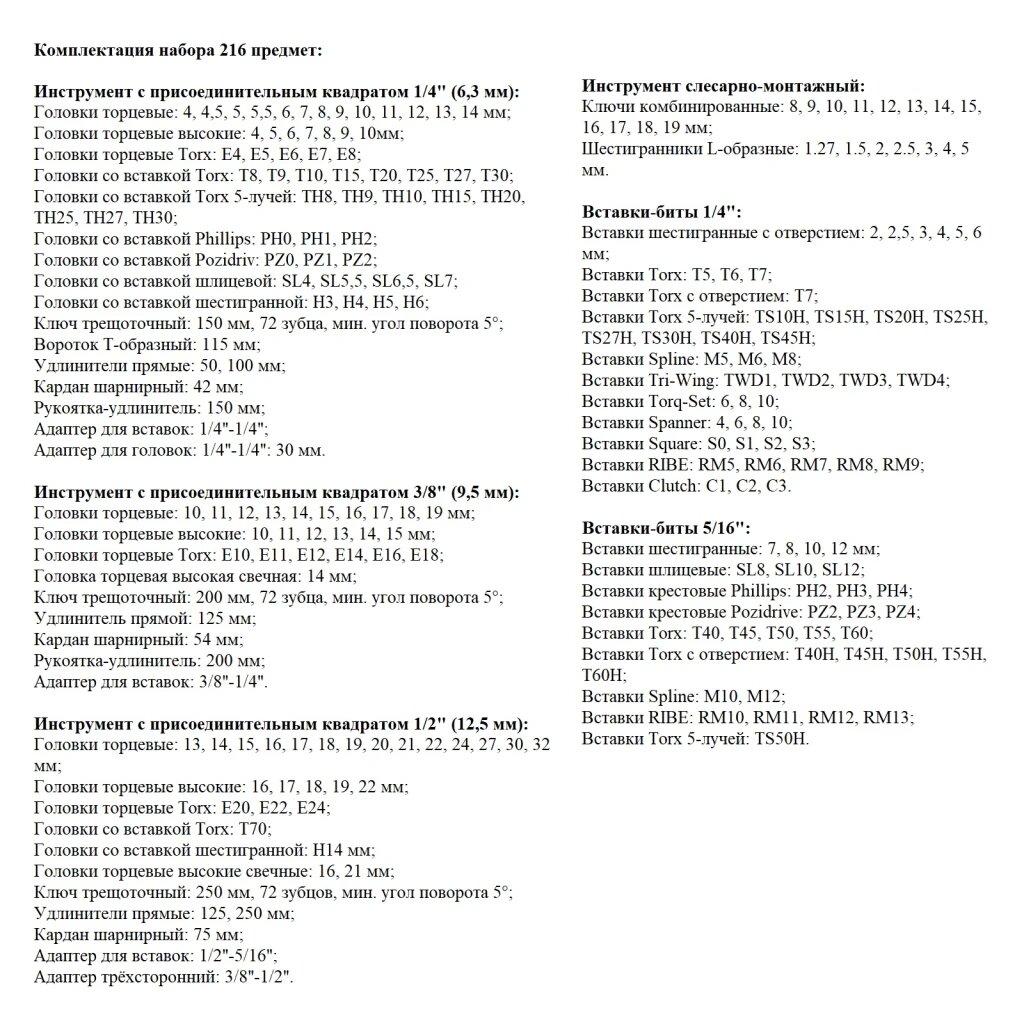 | Биты подробно | 1/4": шестигранные с отверстием: 2, 2,5, 3, 4, 5, 6 мм; Torx: Т5, Т6, Т7; Torx с отверстием: Т7; Torx 5-лучей: TS10Н, TS15Н, TS20Н, TS25Н, TS27Н, TS30Н, TS40Н, TS45Н; Spline: М5, М6, М8; Tri-Wing: TWD1, TWD2, TWD3, TWD4; Torq-Set: 6, 8, 10; Spanner: 4, 6, 8, 10; Square: S0, S1, S2, S3; RIBE: RM5, RM6, RM7, RM8, RM9; Clutch: С1, С2, С3; 5/16": HEX: 7, 8, 10, 12 мм; SL8, SL10, SL12; Phillips: РН2, РН3, РН4; Pozidrive: PZ2, PZ3, PZ4; Torx: Т40, Т45, Т50, Т55, Т60; Torx с отверстием: Т40Н, Т45Н, Т50Н, Т55Н, Т60Н; Spline: М10, М12; RIBE: RM10, RM11, RM12, RM13; Torx 5-лучей: TS50Н |