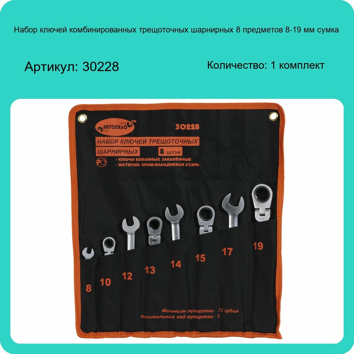 Набор ключей рожково-накидных 8 шт Автодело (трещоточные, шарнирные, 8 предметов, 8-19 мм) тетроновая сумка