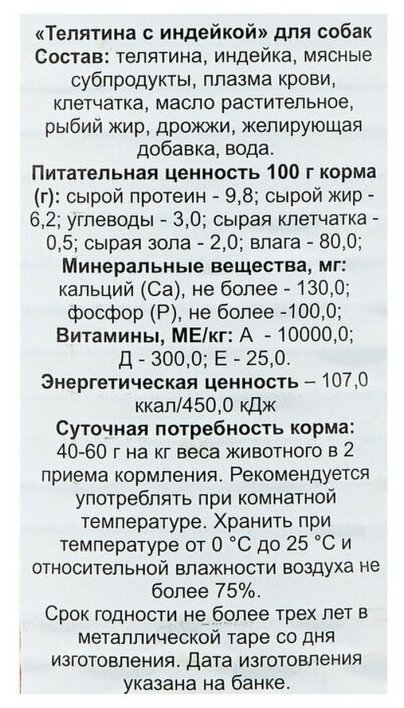 | Состав | телятина, индейка, мясные субпродукты, плазма крови, клетчатка, масло растительное, рыбий жир, дрожжи, желирующая добавка |