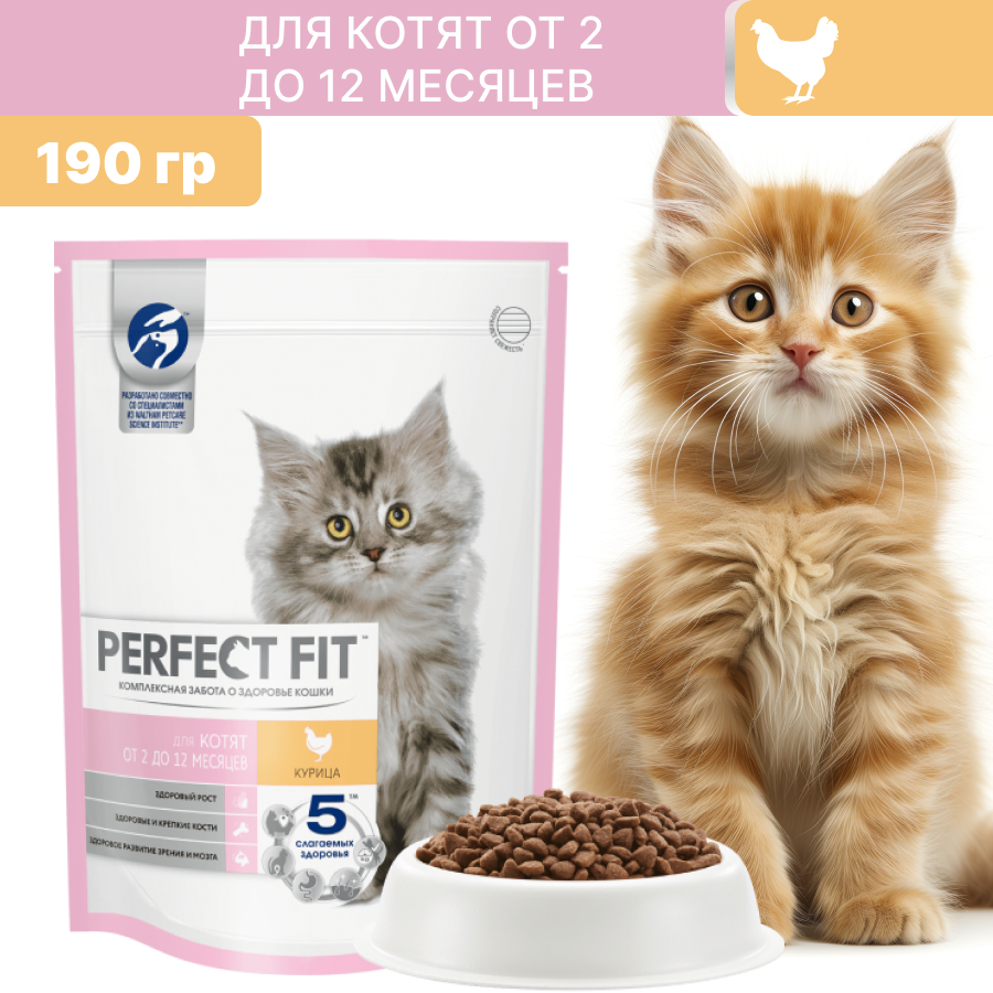 Cухой полнорационный корм PERFECT FIT для котят от 2 до 12 месяцев, с курицей, 4 шт по 190 г
