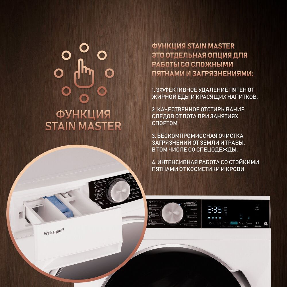 Стиральная машина Weissgauff WMD 47148 DC Inverter Steam с сушкой, инвертором, гарантия 3 года, загрузка 8 кг, 1400 оборотов, 14 программ, Режим с паром Steam Refresh, Функция Stain Master, Режим стирка и сушка, быстрая 15 мин, дозагрузка белья