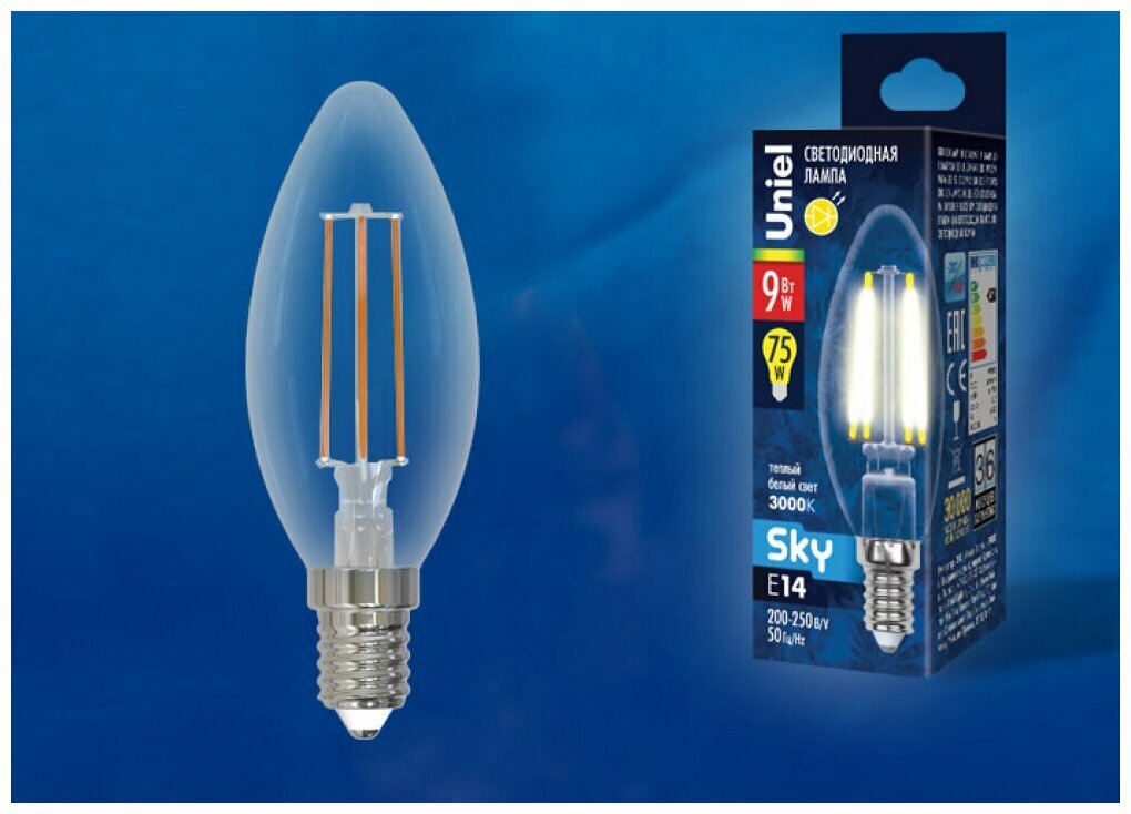 Светодиодная лампа Uniel LED-C35-9W/3000K/E14/CL PLS02WH Форма "свеча", прозрачная. Серия Sky. Теплый белый свет (3000К). Картон. ТМ .