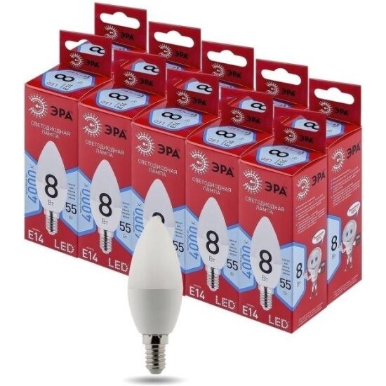 Комплект 10 шт, Лампа светодиодная ЭРА, 8(55)Вт, цоколь Е14, свеча, нейтральный белый, 25000 ч, LED B35-8W-4000-E14, Б0050200