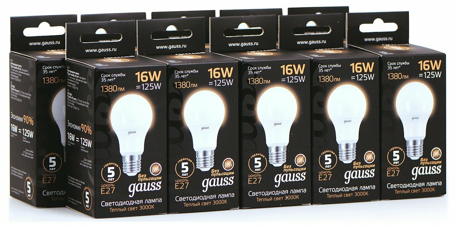 (10 шт) Лампа Gauss LED A60 16W E27 3000K 1/10/50