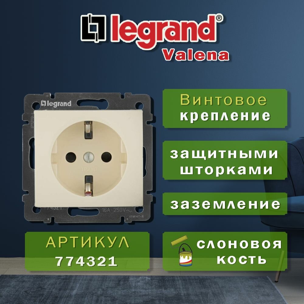 Розетка Legrand 774321 Valena, 16 А, с защитной шторкой, с заземлением, слоновая кость