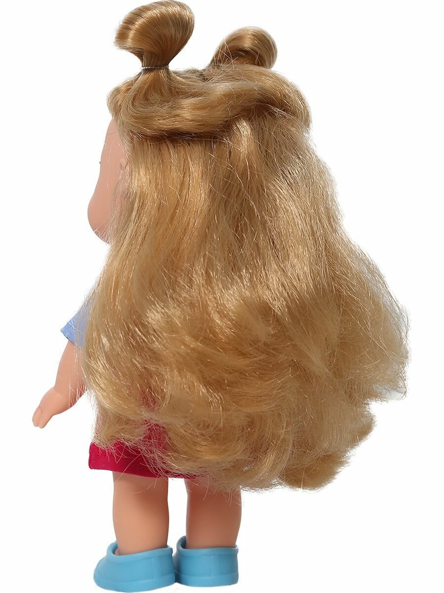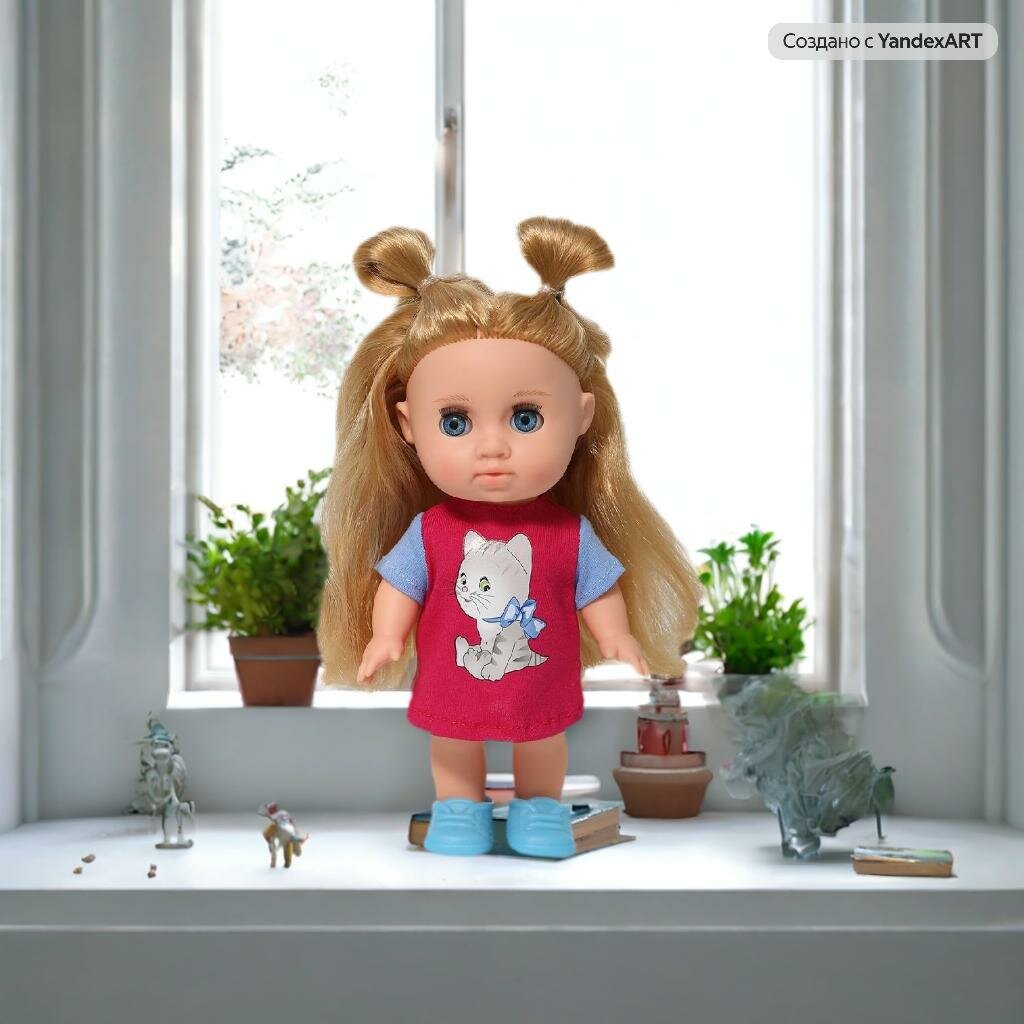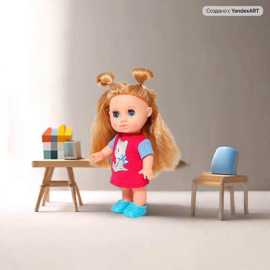 | Дополнительная информация | длина волос — 14 см; в комплект одежды входит: платье из трикотажа двух ярких цветов, на груди наклейка — котенок, застежка сзади на липкую ленту,а ногах туфельки |