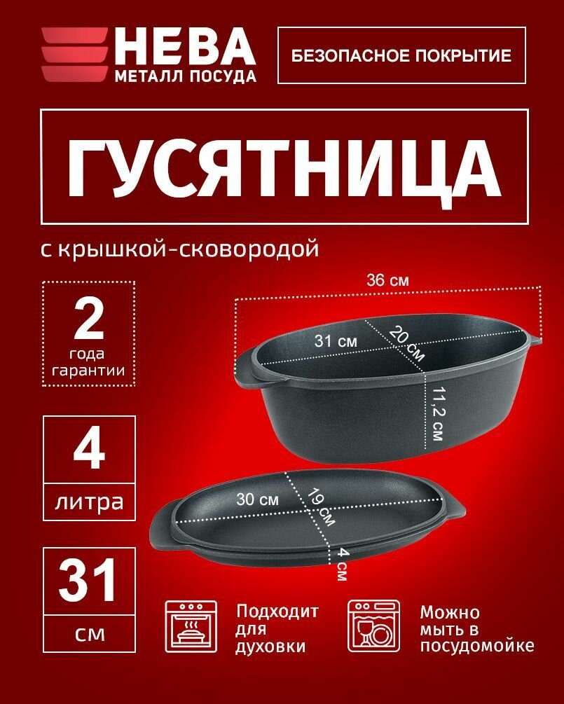 Гусятница Нева Металл Посуда НМП арт. 6740 с крышкой-сковородой, 4 л