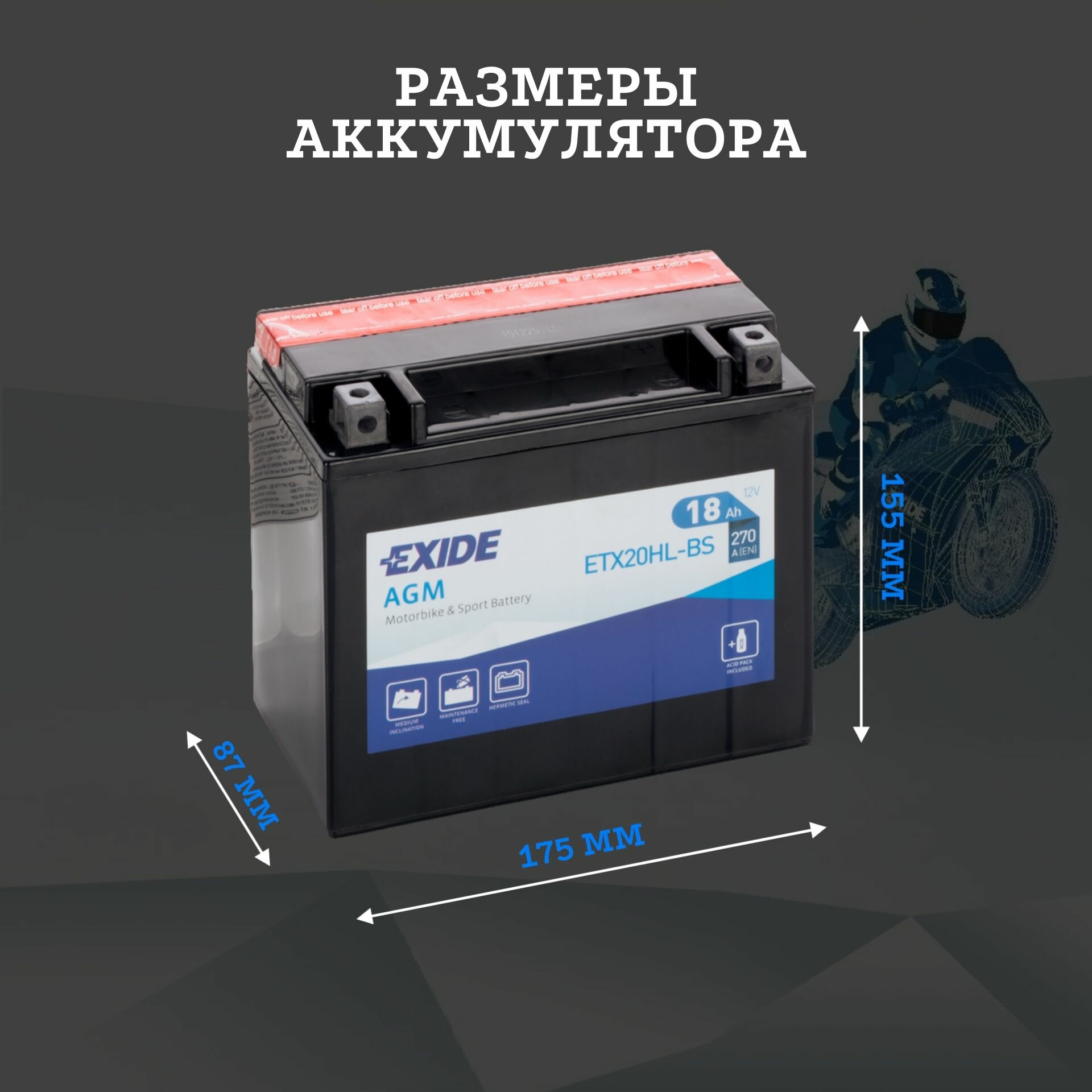Мото акб 12v 18ah 270a agm 175x87x155 /-+/, exide, etx20hl-bs