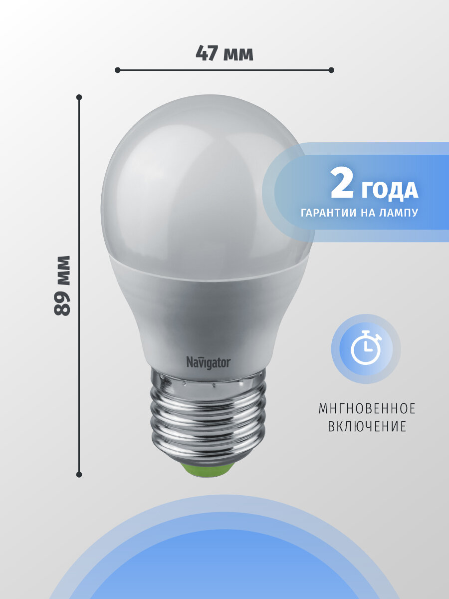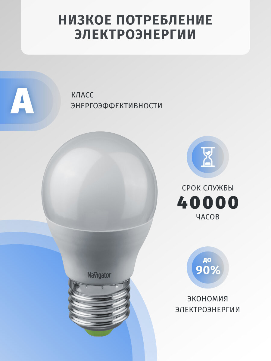 (6 шт.) Светодиодная лампочка Navigator G45, мощность 5 Вт, напряжение питания 220 В, цветовая температура 2700 K, теплый белый свет, световой поток 385 Лм, цоколь E14, размер 45х83 мм