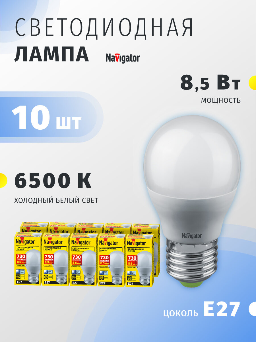 Купить Светодиодная лампа Navigator 61 338, 8.5 Вт, шар Е27, холодный свет 6500K, упаковка 10 шт.