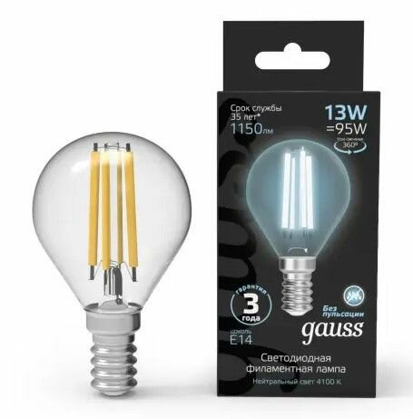 (14 шт.) Светодиодная лампочка Gauss G45 шар филамент, мощность 9 Вт, напряжение питания 150-265 В, цветовая температура 4100 K, нейтральный белый свет, цоколь E14, размер 45х80 мм