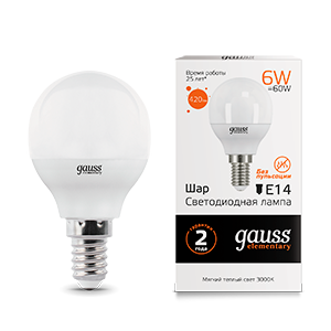 Gauss Лампа светодиодная шар 6W E14 3000K Gauss Elementary 53116