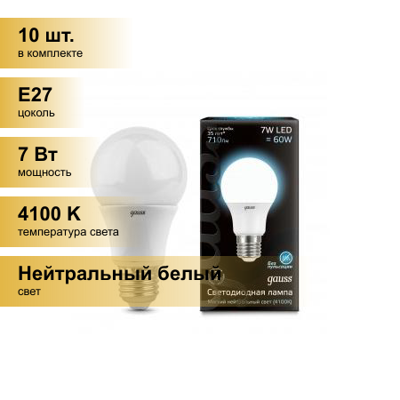 Набор из 10 штук Лампа Gauss A60 7W 710lm 4100K E27 LED 1/10/50