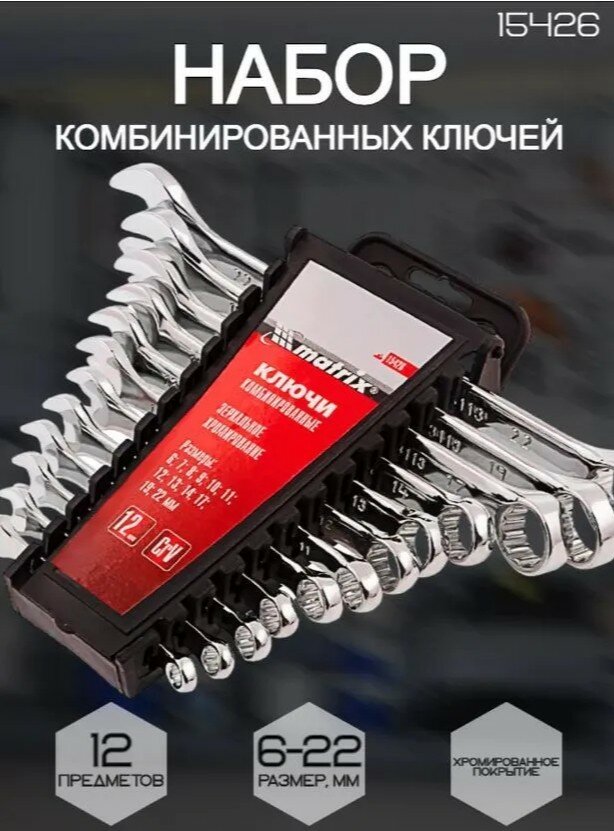 Набор комбинированных ключей MATRIX 15426, 6 - 22 мм, 12 шт., CrV, полированный хром