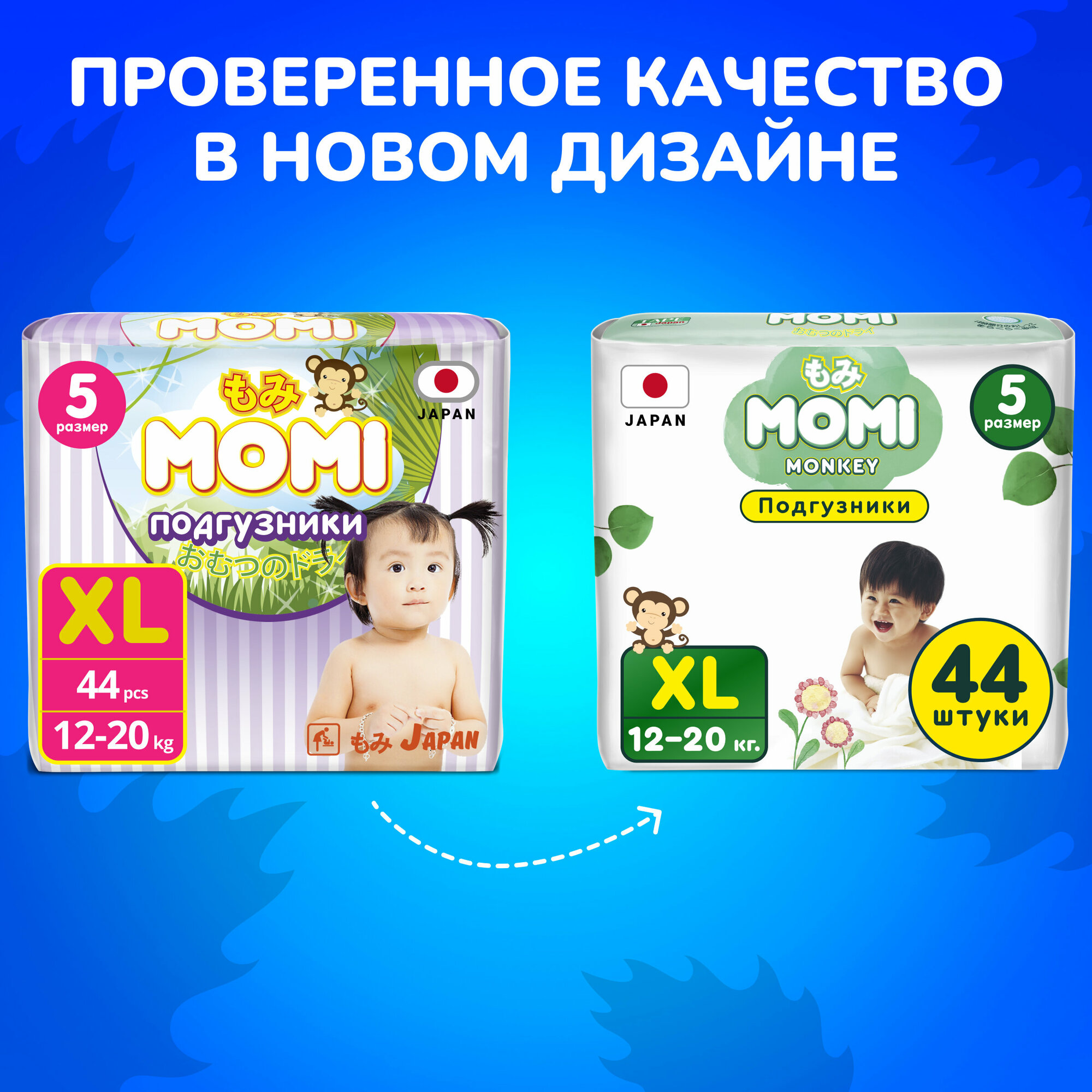Подгузники детские MOMI Monkey 5 XL 12-20 кг, 44 шт