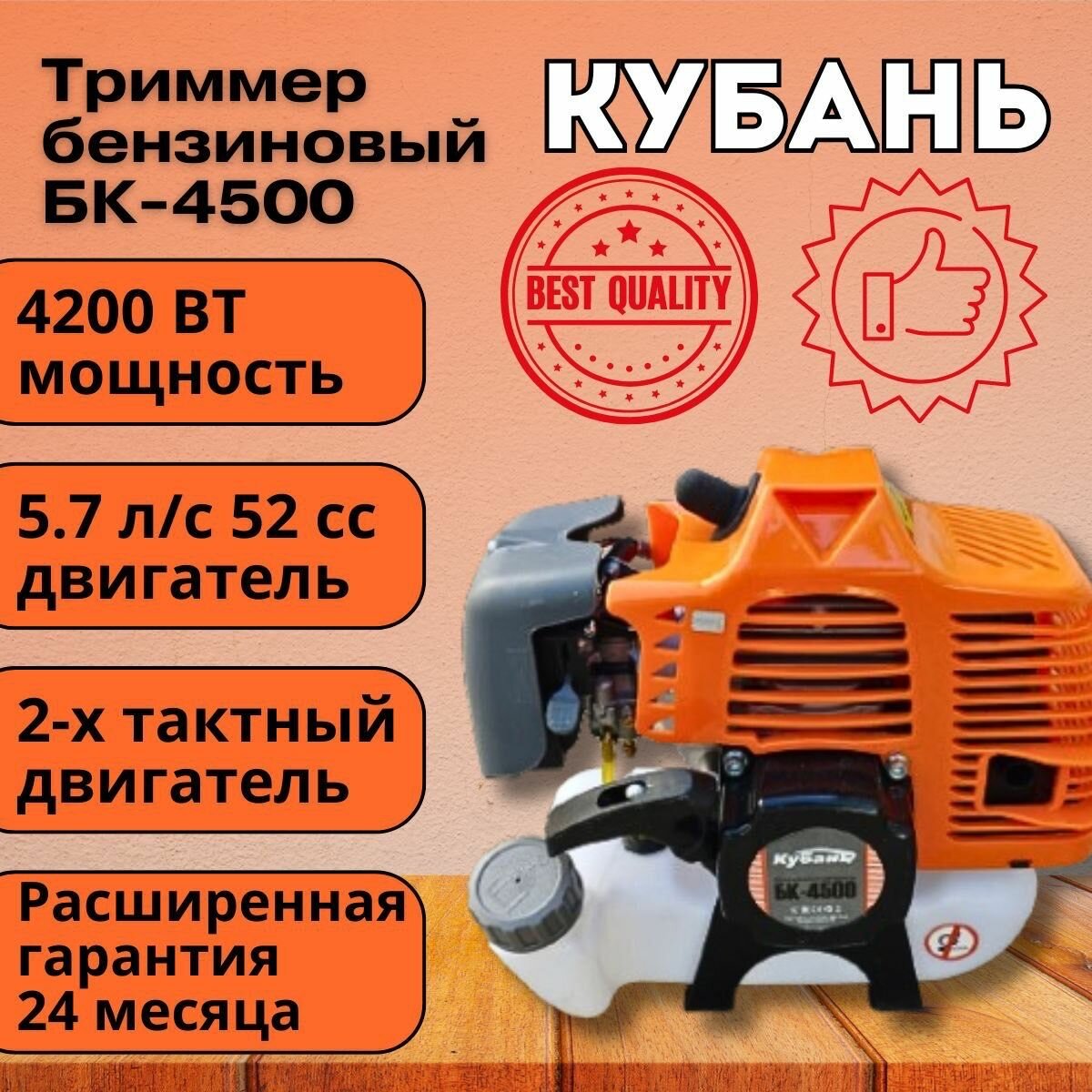 Коса бензиновая кубань БК-4500 (2х тактный двигатель), 52 СС, 4200Вт, 9000об/мин, 415мм Триммер, Газонокосилка