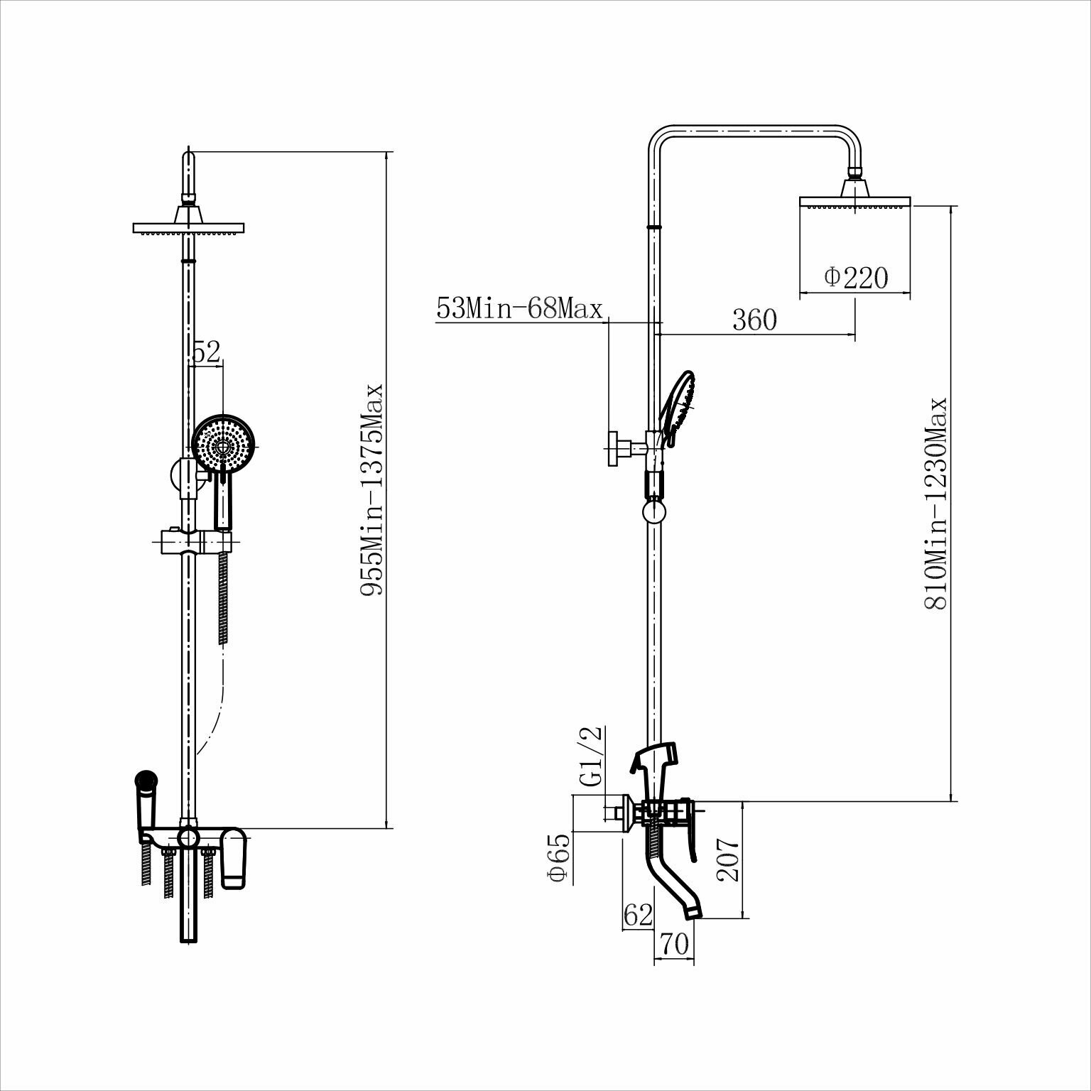| Комплектация | Смеситель / телескопическая штанга / верхний душ / ручная лейка / душевой шланг / гигиеническая лейка со спиральным шлангом / монтажный комплект |