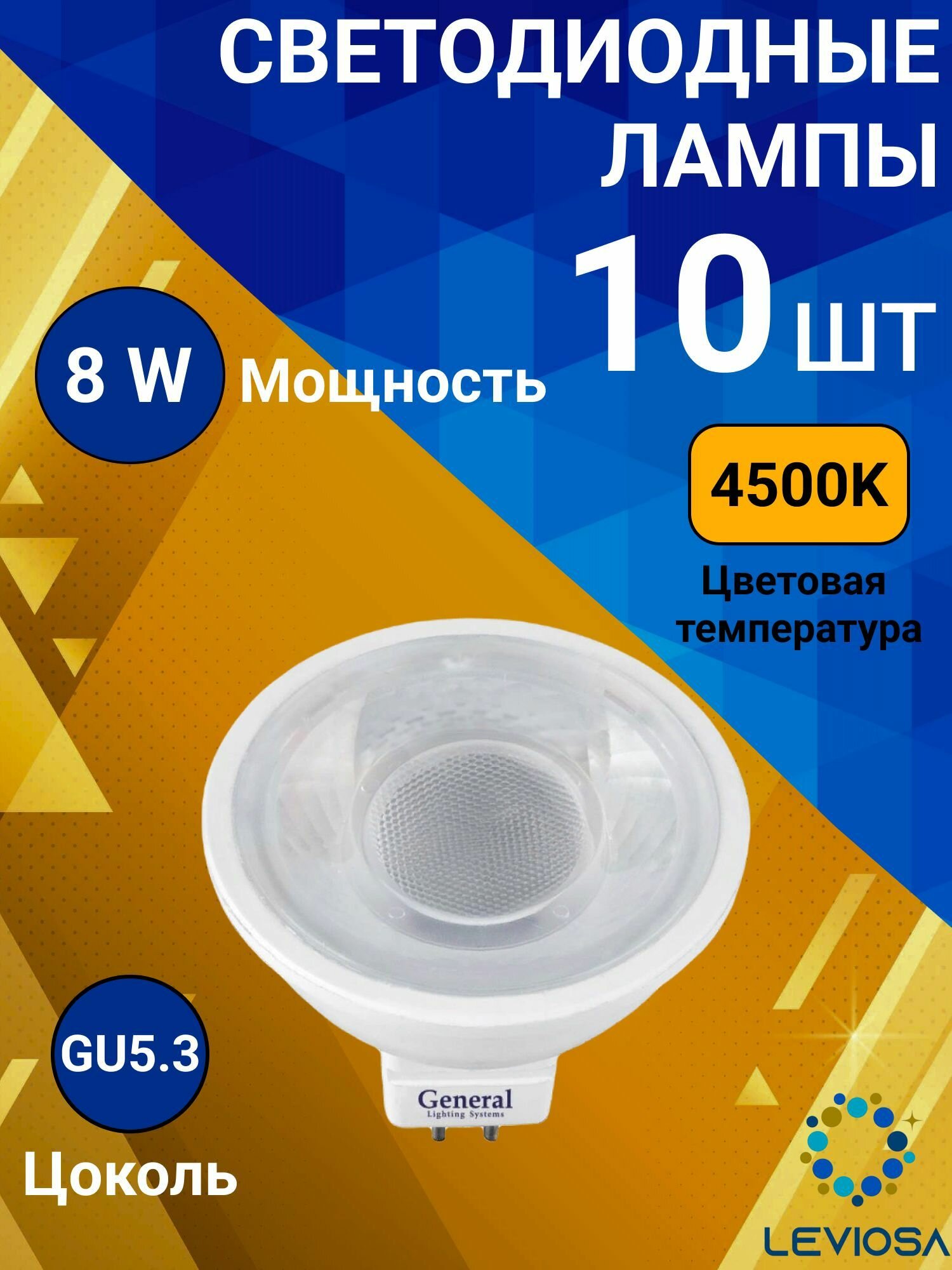 Лампочка светодиодная, General, Комплект из 10 шт, 7 Вт, Цоколь GU5.3, 4500К, Форма лампы Круг, MR16