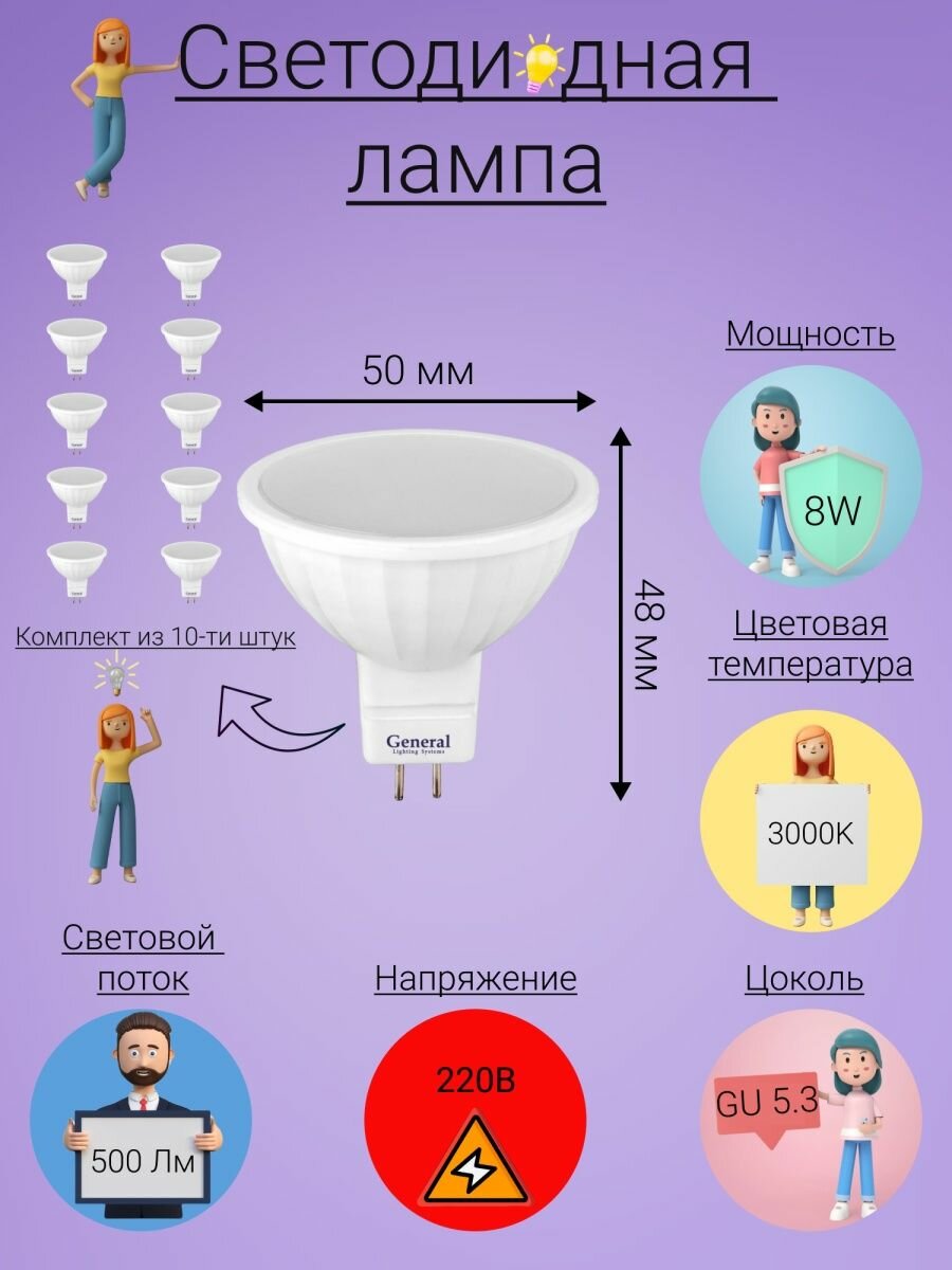 СохранитьЛампочка светодиодная, General, Комплект из 10 шт., 8 Вт, Цоколь GU5.3, 3000К, Форма лампы Круг, MR16 интересное: