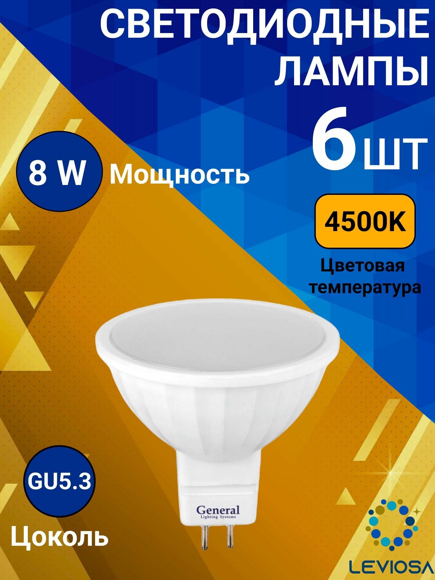 Лампочка светодиодная, General, Комплект из 6 шт., 8 Вт, Цоколь GU5.3, 4500К, Форма лампы Круг, MR16