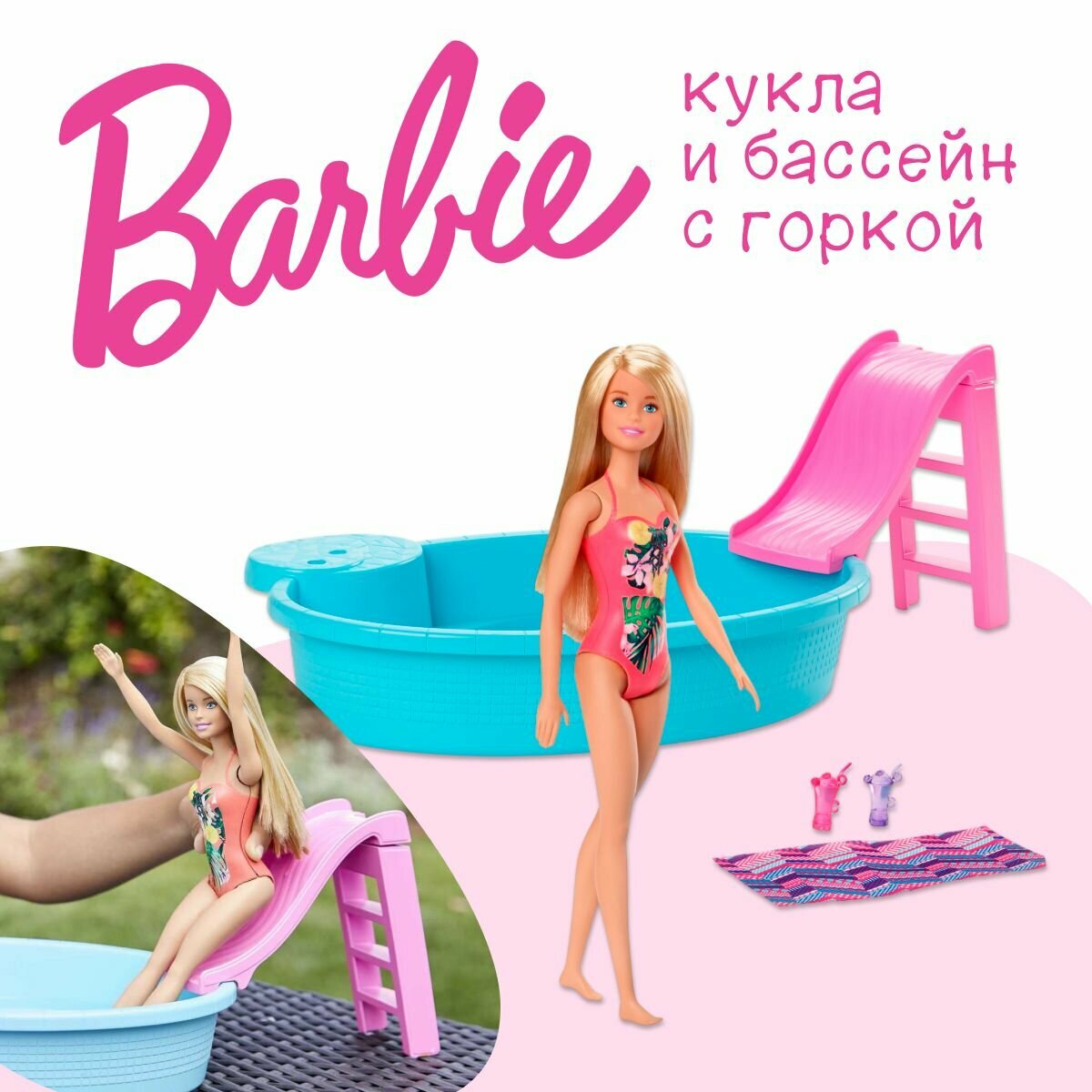 Купить Кукла Barbie GHL91 с аксессуарами - бассейн с горкой Барби Mattel