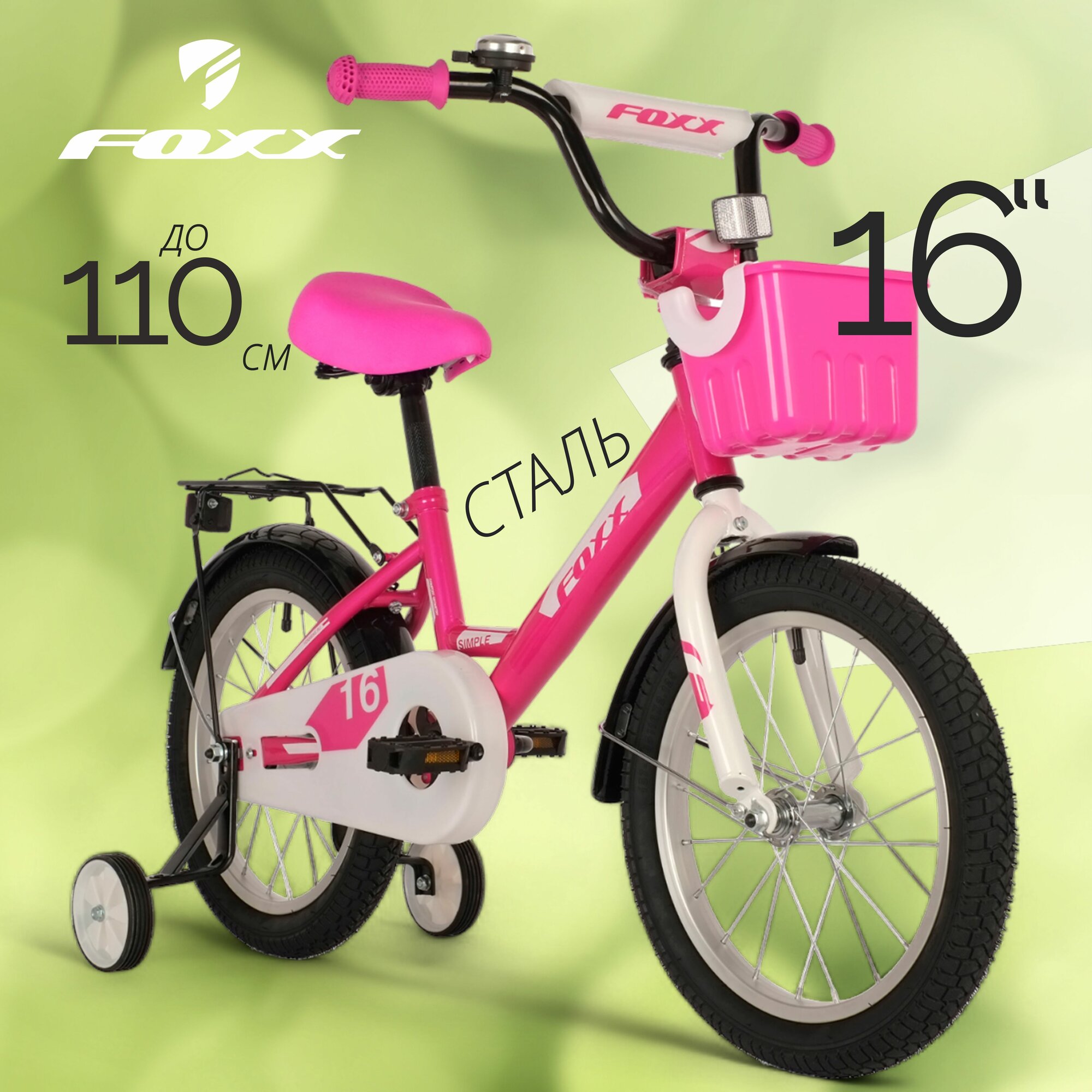 Велосипед FOXX SIMPLE 16" (2021) (Велосипед FOXX 16" SIMPLE розовый, сталь, тормоз нож, крылья, багажник, перед.корзина, полная защ.це)