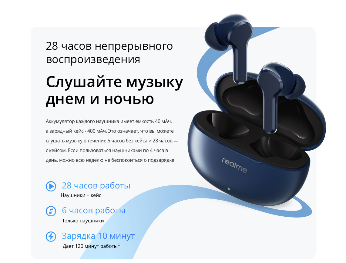 Беспроводные наушники realme Buds T100 синий, ANC, шумоподавление