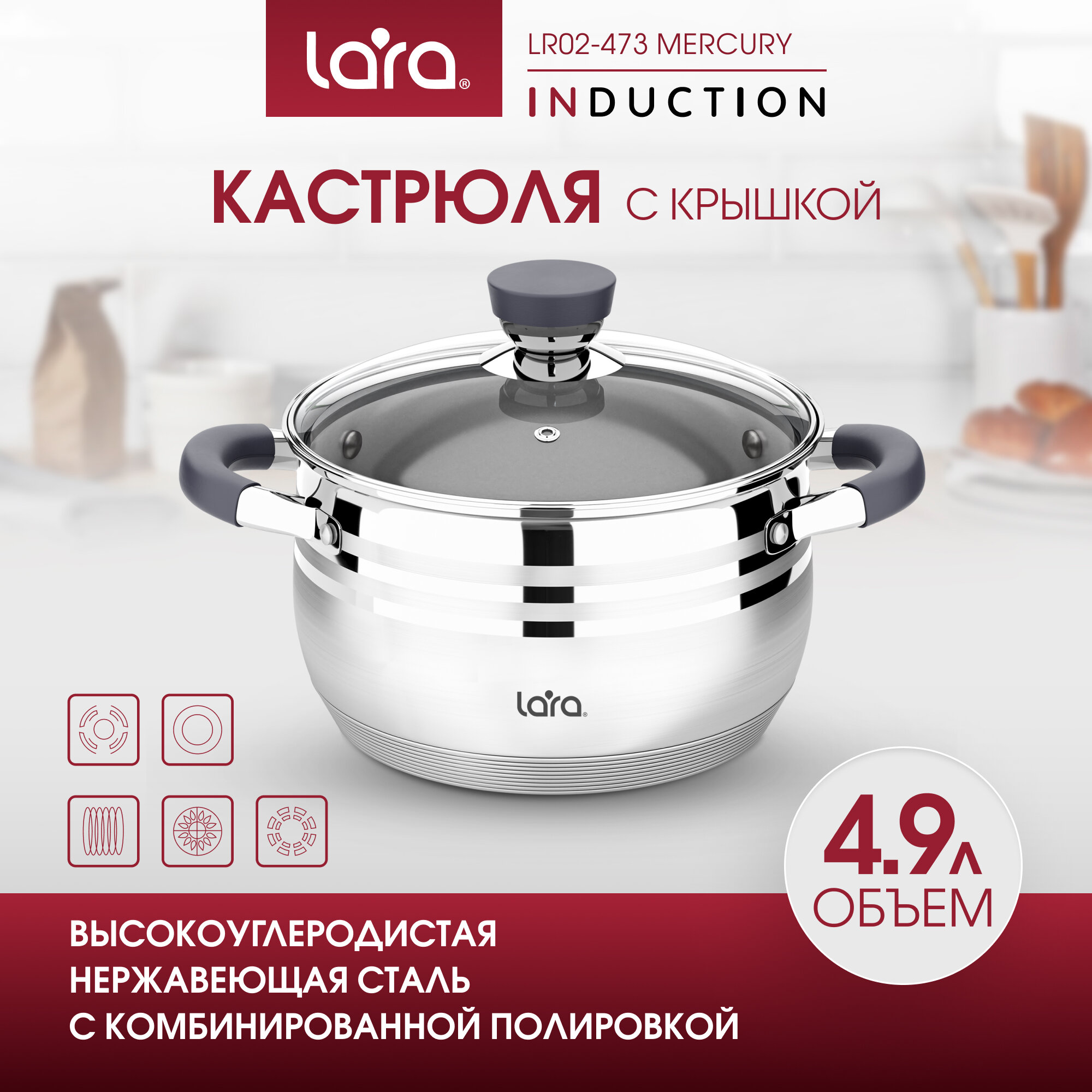 Кастрюля Lara LR02-473 MERCURY 4.9л стекл. крышка стальной