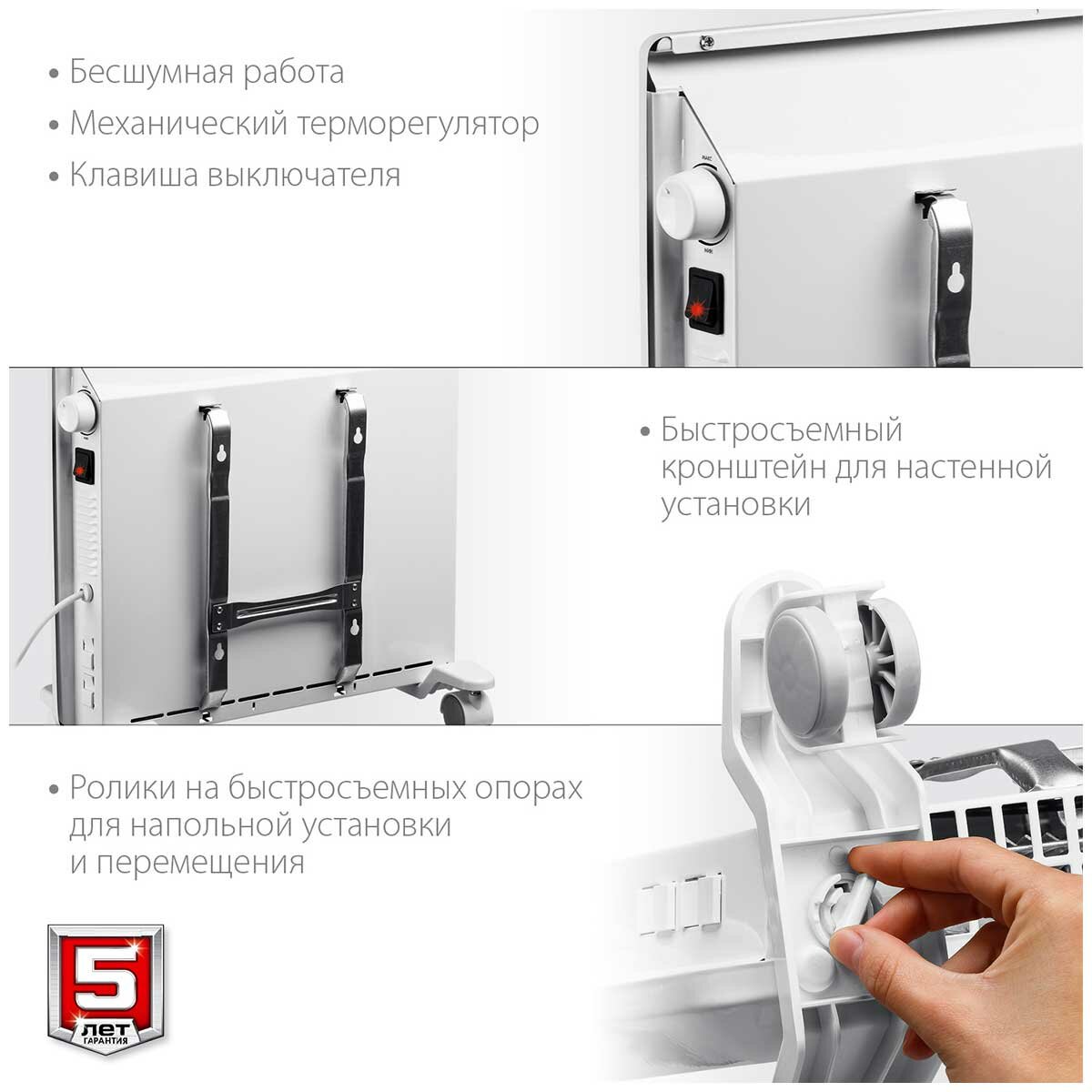 | Подробная комплектация | конвектор электрический 1 шт, кронштейн 1 шт, ролик 4 шт, опора 2 шт, набор крепежа 1 шт, руководство по эксплуатации 1 шт |